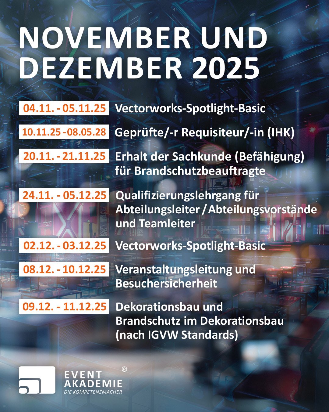 Time flies – Jahresendspurt an der Eventakademie. Lass uns die letzten Monate nutzen, um 2026 mit neuen Skills voll durchzustarten. Bist du dabei? Dann verrate uns, welchen Kurs, du dir nicht entgehen lässt.